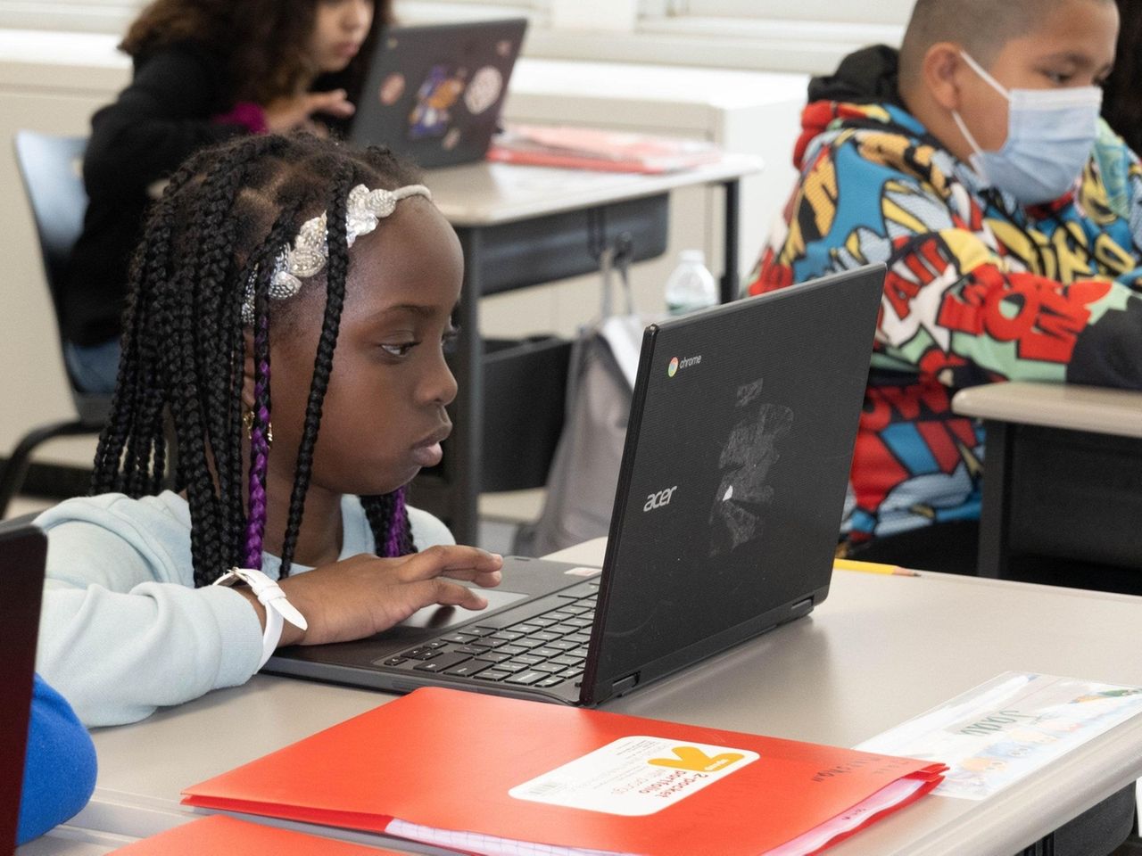 High tech learning: In the Lawrence school system, kindergarten students receive new laptops on their first days of class.
